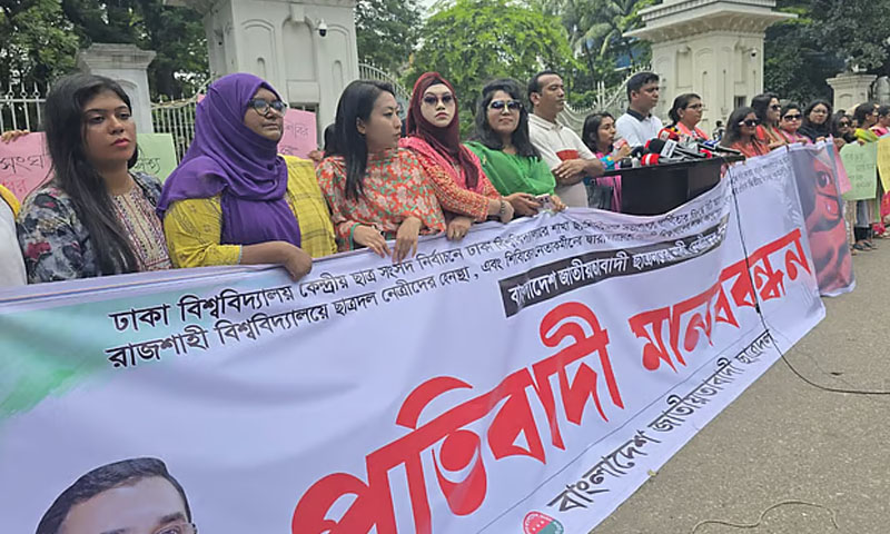 বুধবার (৩ সেপ্টেম্বর) দুপুরে বাংলাদেশ সুপ্রিম কোর্টের প্রধান ফটকে ডাকসু নির্বাচন ঘিরে আদালতে রিট আবেদনকারী ছাত্রীকে গণধর্ষণের হুমকির প্রতিবাদে আয়োজিত এক মানববন্ধনে ছাত্রদলের নেতারা এসব কথা বলেন । ছাত্রদলের যুগ্ম সম্পাদক মানসুরা আলমের সঞ্চালনায় মানববন্ধনে ছাত্রদলের সহসভাপতি রেহানা আক্তার শিরিন, ছাত্রদল নেত্রী ও জগন্নাথ বিশ্ববিদ্যালয়ের শিক্ষার্থী রুপন্তী রত্না, ইনস্টিটিউট অব হেলথ টেকনোলজির শিক্ষার্থী সাদিয়া সুলতানাসহ উপস্থিত ছিলেন ছাত্রদলের নারী নেতা–কর্মীরা।