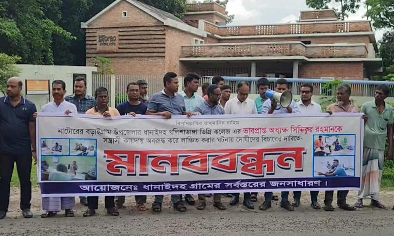 আবু মুসা, নাটোর : নাটোরের বড়াইগ্রামে খলিশা ডাঙ্গা ডিগ্রী মহাবিদ্যালয়ের অধ্যক্ষ (ভারপ্রাপ্ত) সিদ্দিকুর রহমানকে অপদস্থ ও লাঞ্ছিত করার প্রতিবাদে মানববন্ধন অনুষ্ঠিত হয়েছে। বুধবার নাটোর-পাবনা মহাসড়কের ধানাইদহ বাজারে ধানইদহ গ্রামবাসী এই কর্মসূচীর আয়োজন করেন। তারা এ ঘটনায় জড়িতদের শাস্তির দাবি জানিয়েছেন।