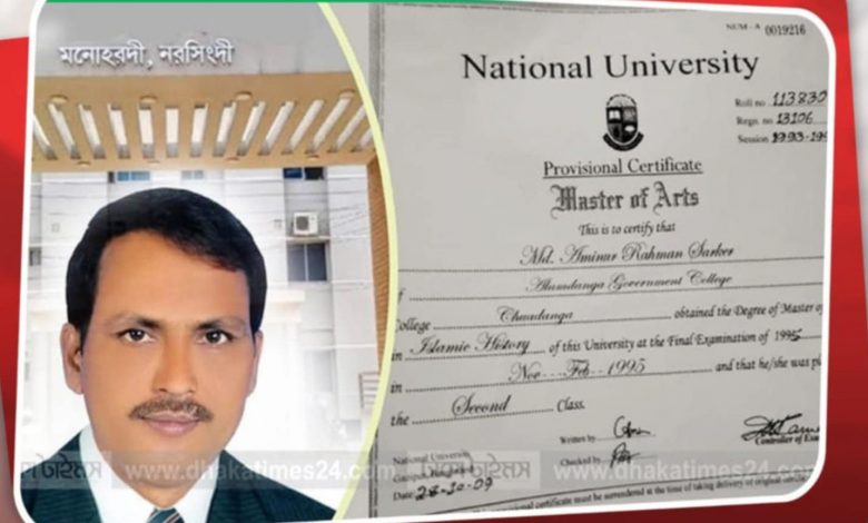 মনোহরদী সংবাদদাতা : নরসিংদীর মনোহরদীতে উপজেলা বিএনপির সদস্য সচিব মো. আমিনুর রহমান সরকার দোলনের বিরুদ্ধে। ভুয়া স্নাতকোত্তর (মাস্টার্স) সনদ ব্যবহার করে একাধিক শিক্ষা প্রতিষ্ঠানের গুরুত্বপূর্ণ পদ দখলের অভিযোগ উঠেছে। সামাজিক যোগাযোগ মাধ্যমে বিষয়টি ফাঁস হওয়ার পর এলাকায় ব্যাপক আলোচনার ঝড় উঠেছে। স্থানীয় সূত্রে