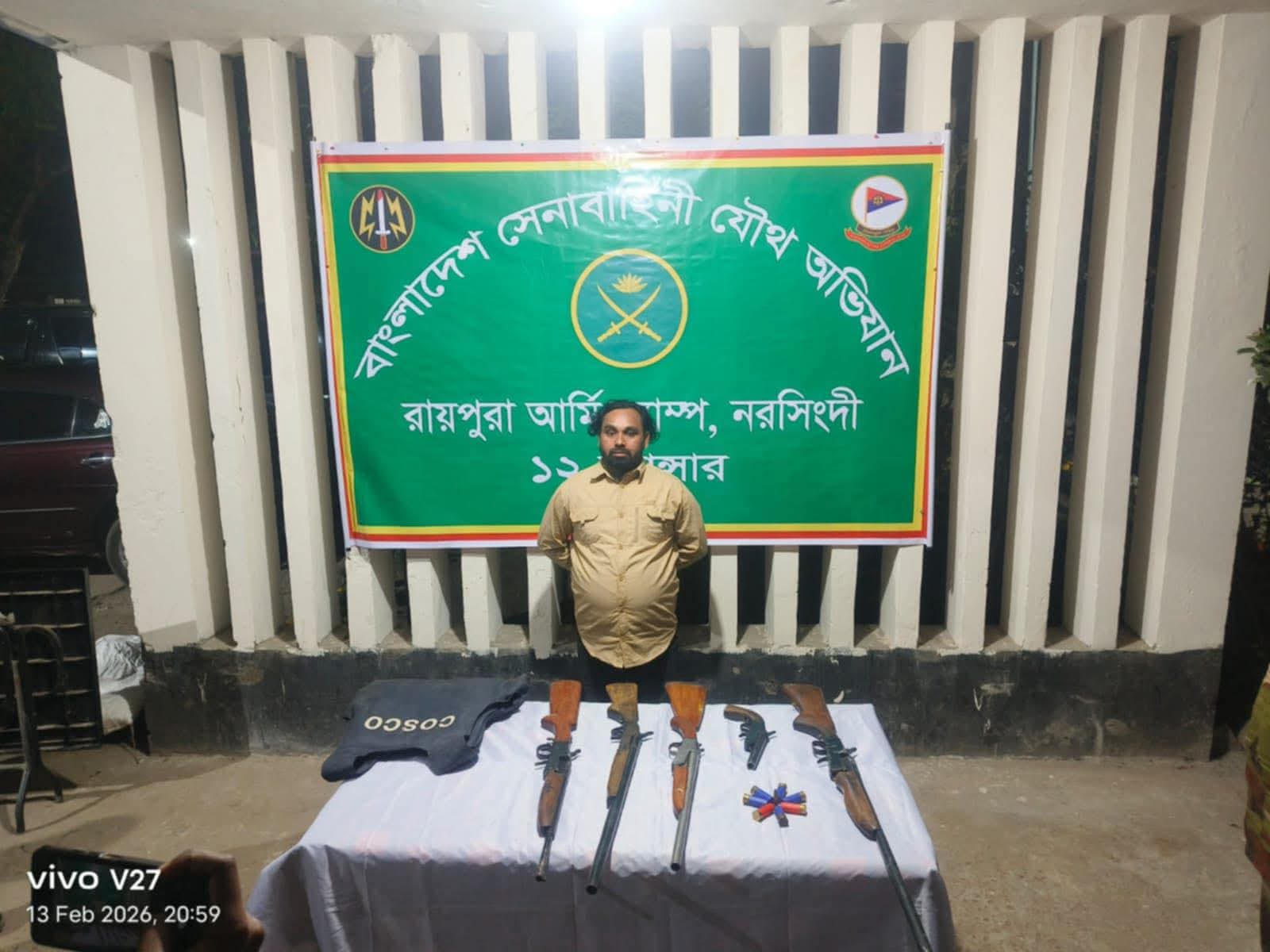 আটককৃত ব্যক্তি নূর আলম ওরফে কাবিলা। তিনি রায়পুরা উপজেলার দুর্গম চরাঞ্চলের পাড়াতলী গ্রামের বাসিন্দা। অভিযানের সময় তার কাছ থেকে ৪টি দেশীয় তৈরি রাইফেল, ১টি দেশীয় পিস্তল, ১টি বুলেটপ্রুফ জ্যাকেট এবং ৯ রাউন্ড বিভিন্ন ধরনের তাজা গুলি উদ্ধার করা হয়।