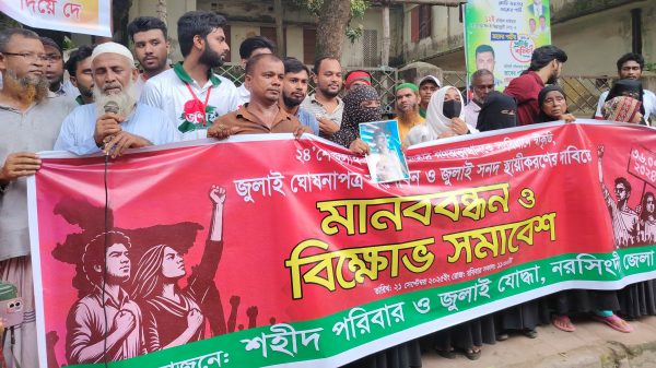 জুলাইয়ের ছাত্র-জনতার গণঅভ্যুত্থানকে সংবিধানে স্বীকৃতি, জুলাই ঘোষণাপত্র সংশোধন ও জুলাই সনদ স্থায়ীকরণের দাবিতে নরসিংদীতে বিক্ষোভ মিছিল ও মানববন্ধন অনুষ্ঠিত হয়েছে। আজ রবিবার (২১ সেপ্টেম্বর) দুপুরে নরসিংদী পৌর পার্ক জুলাই চত্ত্বর