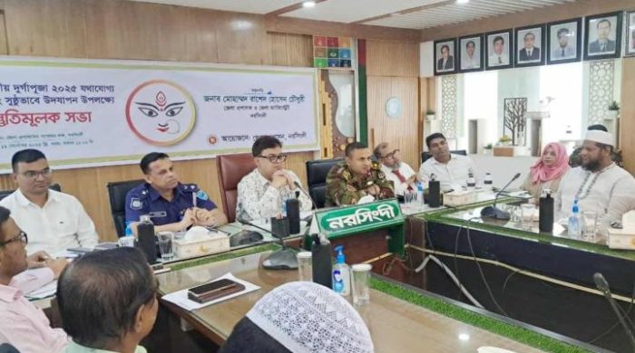 নরসিংদীতে আসন্ন শারদীয় দুর্গাপূজা যথাযোগ্য মর্যাদায় সুষ্ঠুভাবে উদযাপনের লক্ষ্যে ১১ সেপ্টেম্বর (বৃহস্পতিবার) এক প্রস্তুতিমূলক সভা নরসিংদী জেলা প্রশাসকের সম্মেলন কক্ষে অনুষ্ঠিত হয়েছে । নরসিংদী জেলা প্রশাসক মোহাম্মদ রাশেদ হোসেনচৌধুরীর সভাপতিত্বে